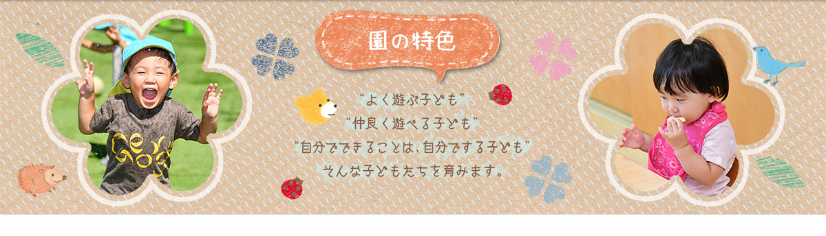 - 一人一人の成長の芽を大切にし、遊ぶ楽しさや友達と一緒にいる喜びなどを感じられる保育を大切にします。